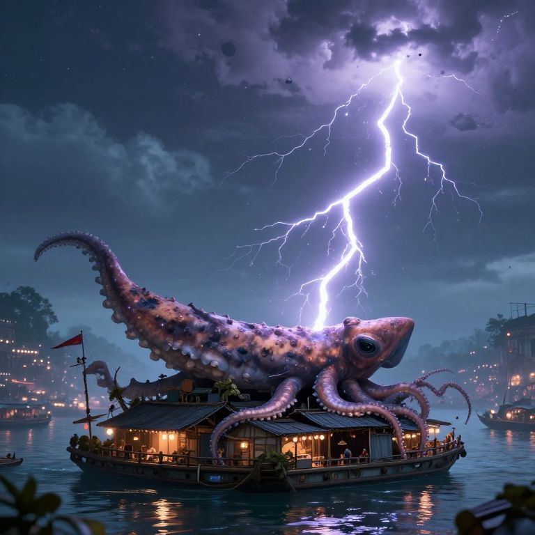 This digital artwork depicts a massive, purple-and-brown tentacled creature with a chameleon-like texture, positioned atop a floating, traditional Asian-style wooden boat. The boat is illuminated by warm yellow lights, and a flag flutters at the stern. Above, a dramatic, lightning-filled night sky dominates, with bright blue and white lightning bolts striking through dark, stormy clouds. The water below reflects the boat and lightning, creating a dynamic, surreal scene. In the background, dimly lit buildings and trees are visible, adding depth to the scene. The overall style is hyper-realistic with a fantastical twist.