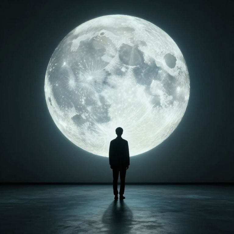 Photograph of a silhouetted person standing in front of a massive, glowing full moon that dominates the dark, empty background. The person, centered and facing the moon, wears a simple jacket and pants, with their hands by their sides. The moon's bright, detailed surface contrasts sharply with the dark, smooth floor and sky, creating a dramatic, almost surreal effect. The overall color palette is dominated by deep blues and stark whites, emphasizing the moon's luminosity and the person's silhouette. The image conveys a sense of awe and solitude.