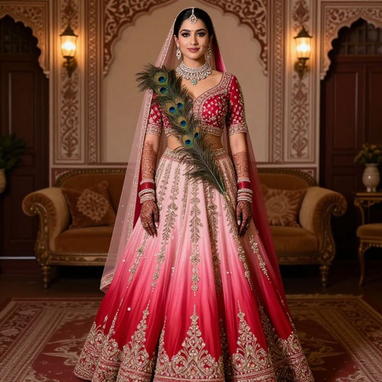A fashionable bride with sharp cheekbones, dark eyeliner, and a subtle curve of her lips wearing a custom bridal lehenga with a dramatic peacock feather accent and a red-to-pink gradient, standing in a heritage-style mansion with a henna-themed wall behind her