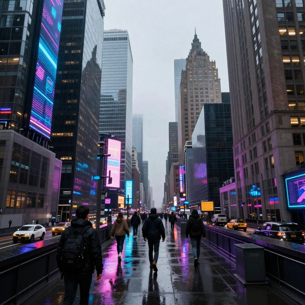 Hiper realismo cityscape at dusk, glowing neon signs reflecting on wet streets, ultra-detailed architecture and realistic water puddles, cinematic lighting with deep shadows