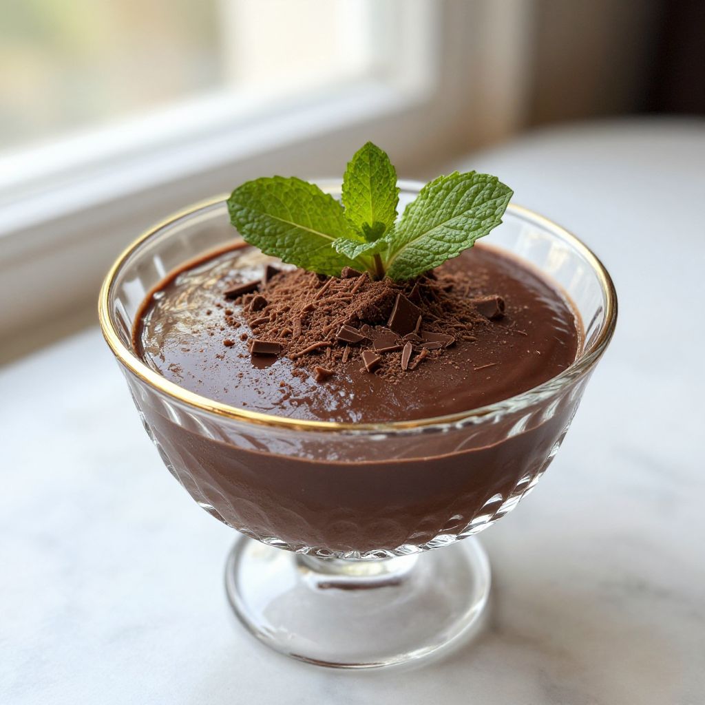 Rich dark chocolate mousse topped with finely grated chocolate and fresh mint leaves, served in an elegant crystal dessert bowl with a gold rim. The dessert is placed on a marble surface with soft natural window light enhancing its detailed texture and glossy appearance.