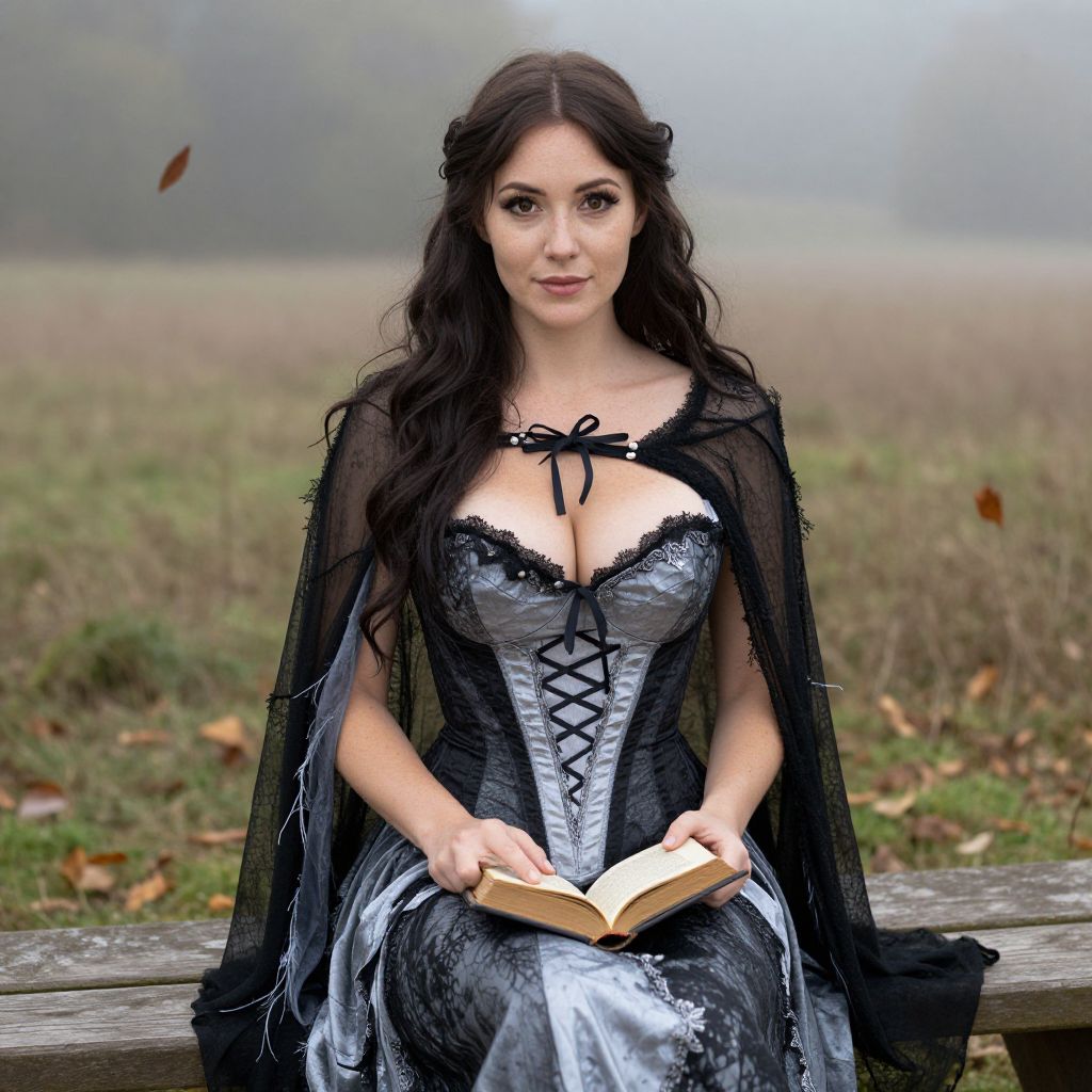 A well-lit, natural daylight scene of a woman with soft, freckled skin and warm brown eyes, wearing a corset witch costume with a flowing black-and-silver design, including a corset with hidden lace patterns and a long, tattered cloak. She sits on a wooden bench in a foggy countryside meadow with autumn leaves blowing gently, a small wooden spellbook open on her lap, giving the image a magical yet grounded realism.. The woman has big breasts and cute face