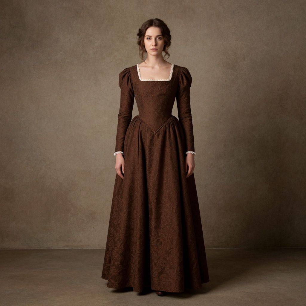 Photograph of a young woman with pale skin and dark brown, wavy hair styled in loose curls, standing against a textured, grayish-brown studio background. She is wearing a long, dark brown, Victorian-style dress with puffed sleeves, a square neckline, and intricate lace detailing. The dress has a fitted bodice and a full, flowing skirt. She stands with a straight posture, hands relaxed by her sides, and gazes directly at the camera with a neutral expression. The lighting is soft, highlighting her delicate features and the details of her dress.