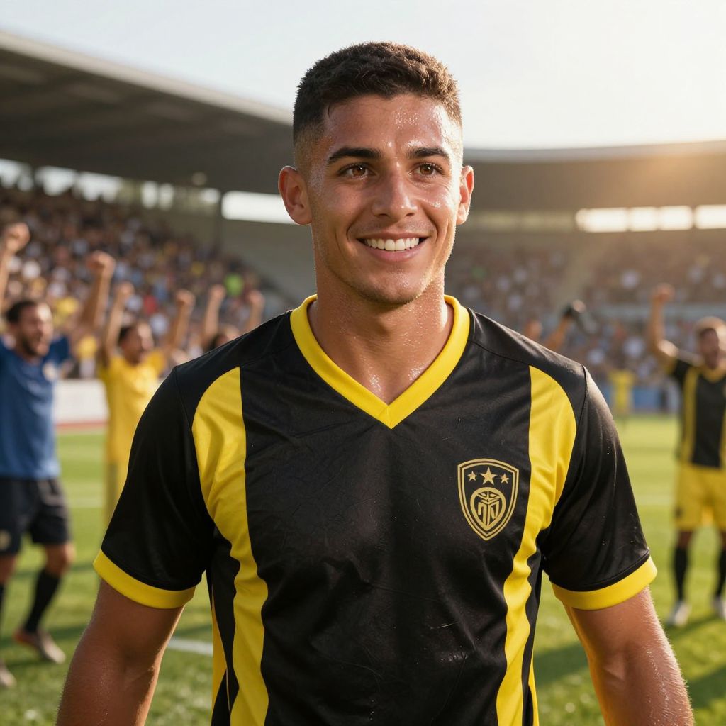 A confident man in his late 20s with short, neatly trimmed dark hair, warm brown eyes that glow with determination, and a bright, athletic smile, wearing a black and yellow soccer jersey with a bold gold emblem on the front, the fabric slightly wrinkled from movement and sweat, highlighting his dedication and passion for the game. He stands in a sunny stadium setting, surrounded by a vibrant crowd cheering loudly in the background, with the golden afternoon light casting a warm glow over the field, the air filled with energy and excitement. The scene captures not just the moment, but the spirit of a true athlete who lives for the game—focused, proud, and fully immersed in the thrill of competition.