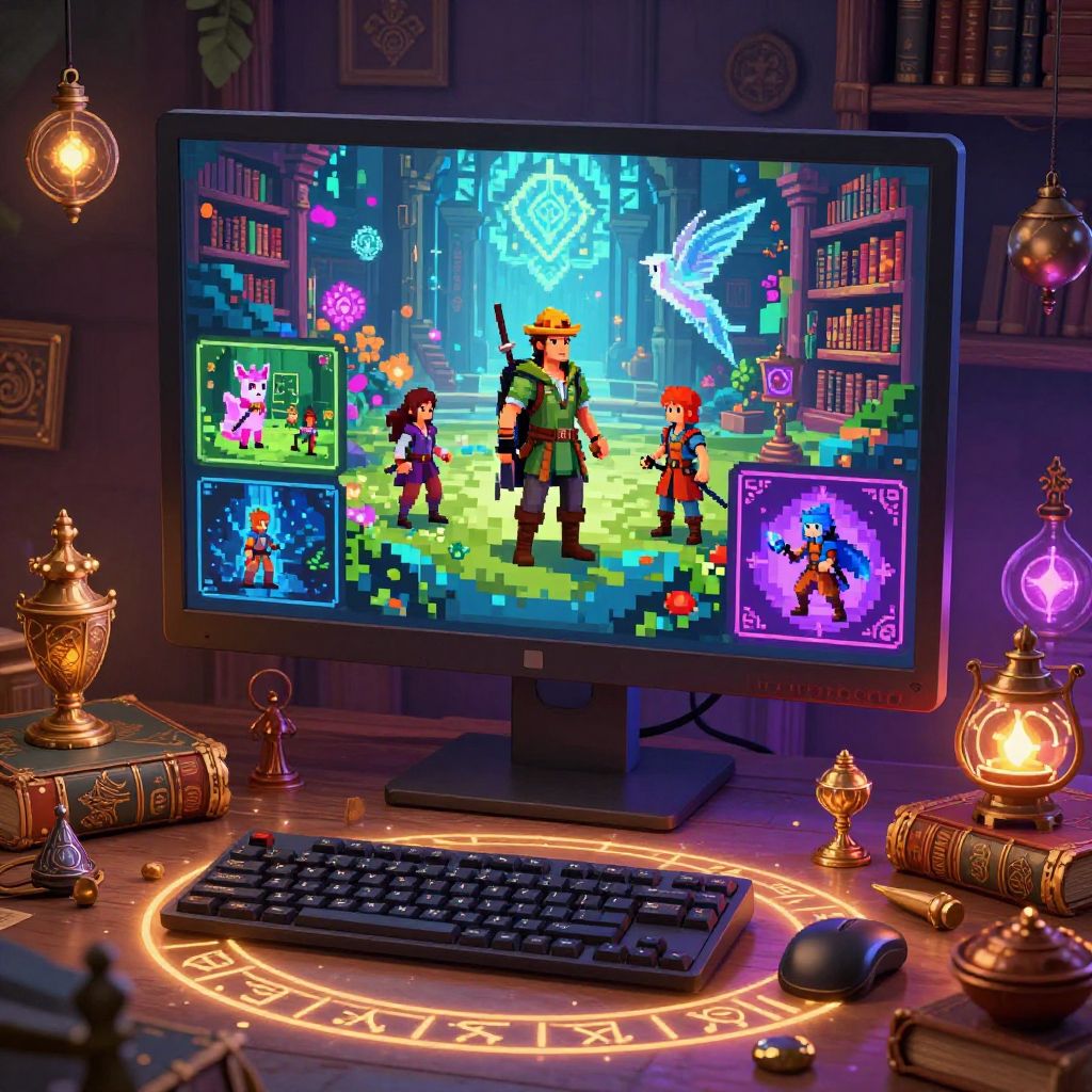 Dnd character ai generator scene, a fantasy-themed computer surrounded by magical artifacts, ancient tomes, and glowing runes, producing pixelated images of mythical DnD adventurers, ethereal wisps, enchanted library setting, vivid colors