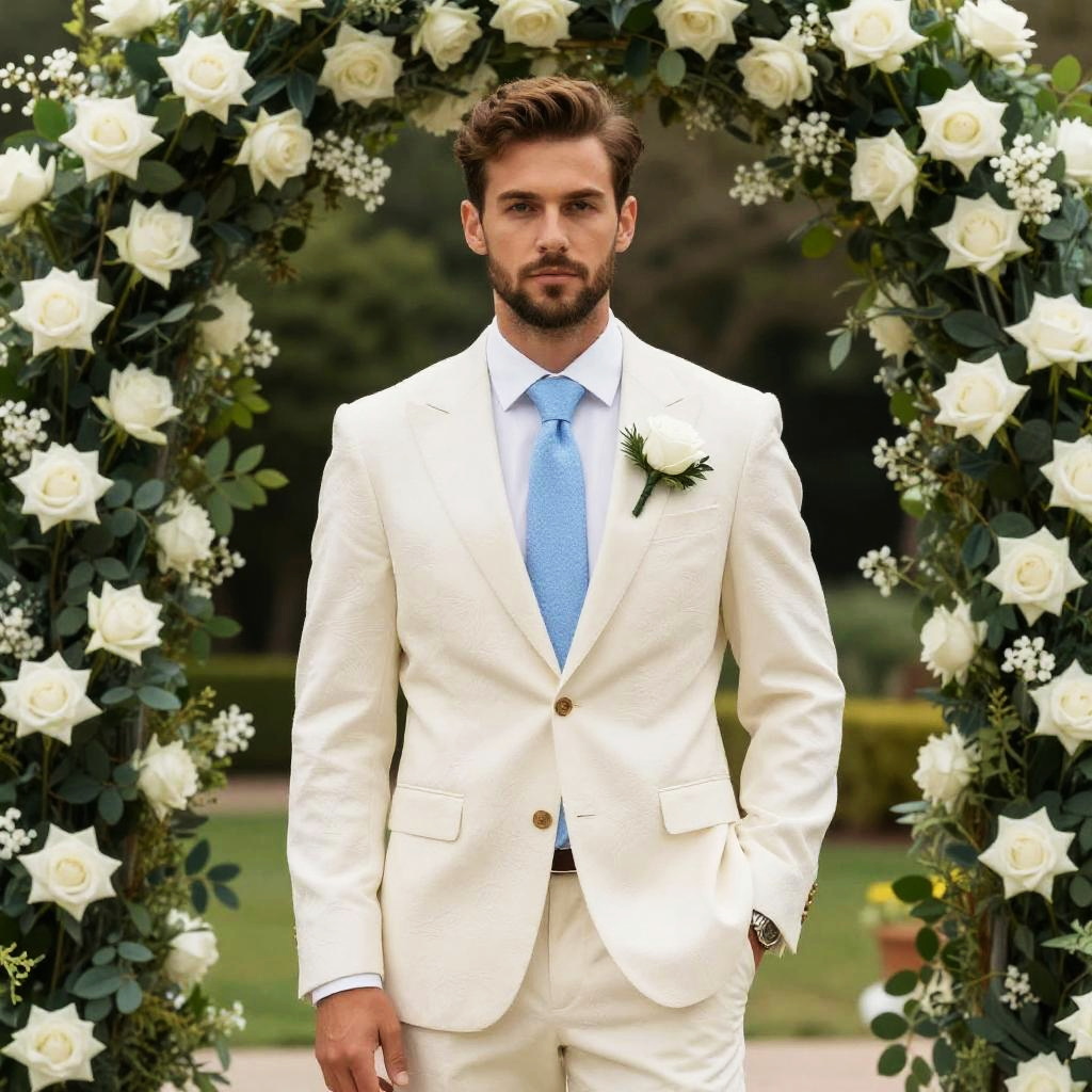 A handsome man stands confidently in front of a lush floral arch adorned with white roses and greenery, dressed in an elegant cream-colored textured suit with a light blue tie and a single white rose boutonniere. The setting suggests a formal occasion, likely a wedding, capturing a classic and sophisticated style.