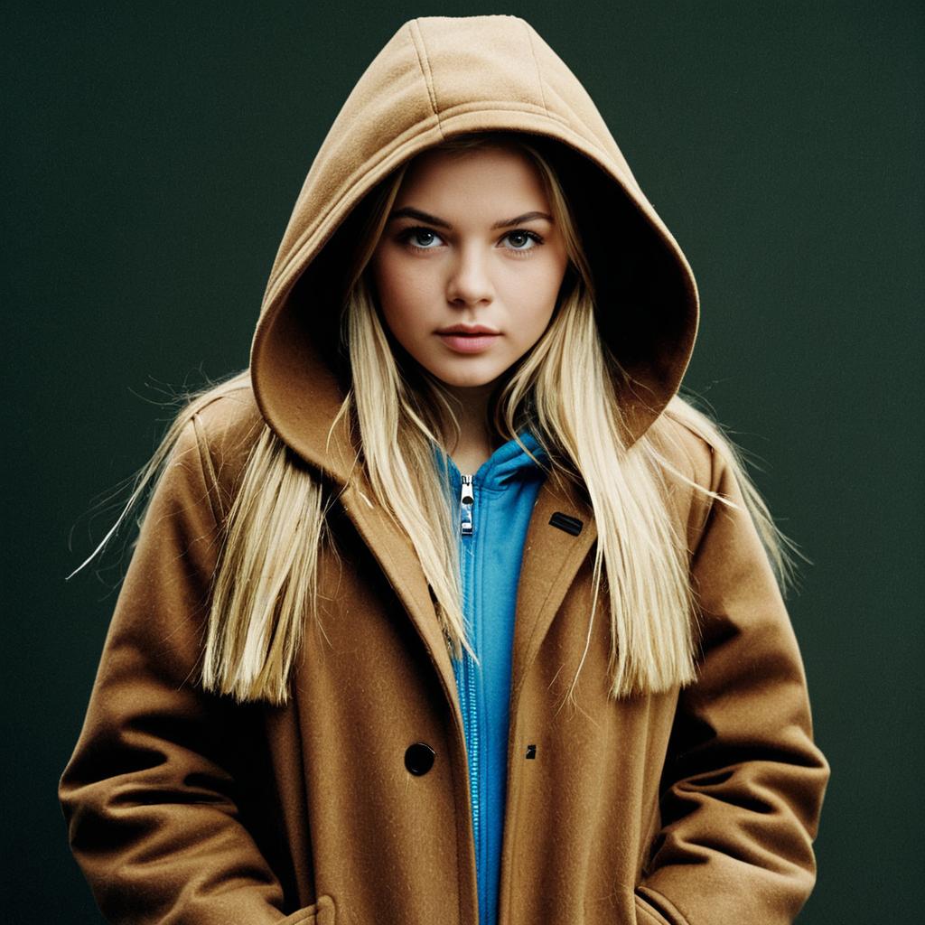 Portrait of a young boy with brown hair wearing a grey hoodie and dark pants standing against a plain dark background. The boy has a neutral expression with the hoodie hood up and hands relaxed by his sides. The image captures a casual and realistic style.