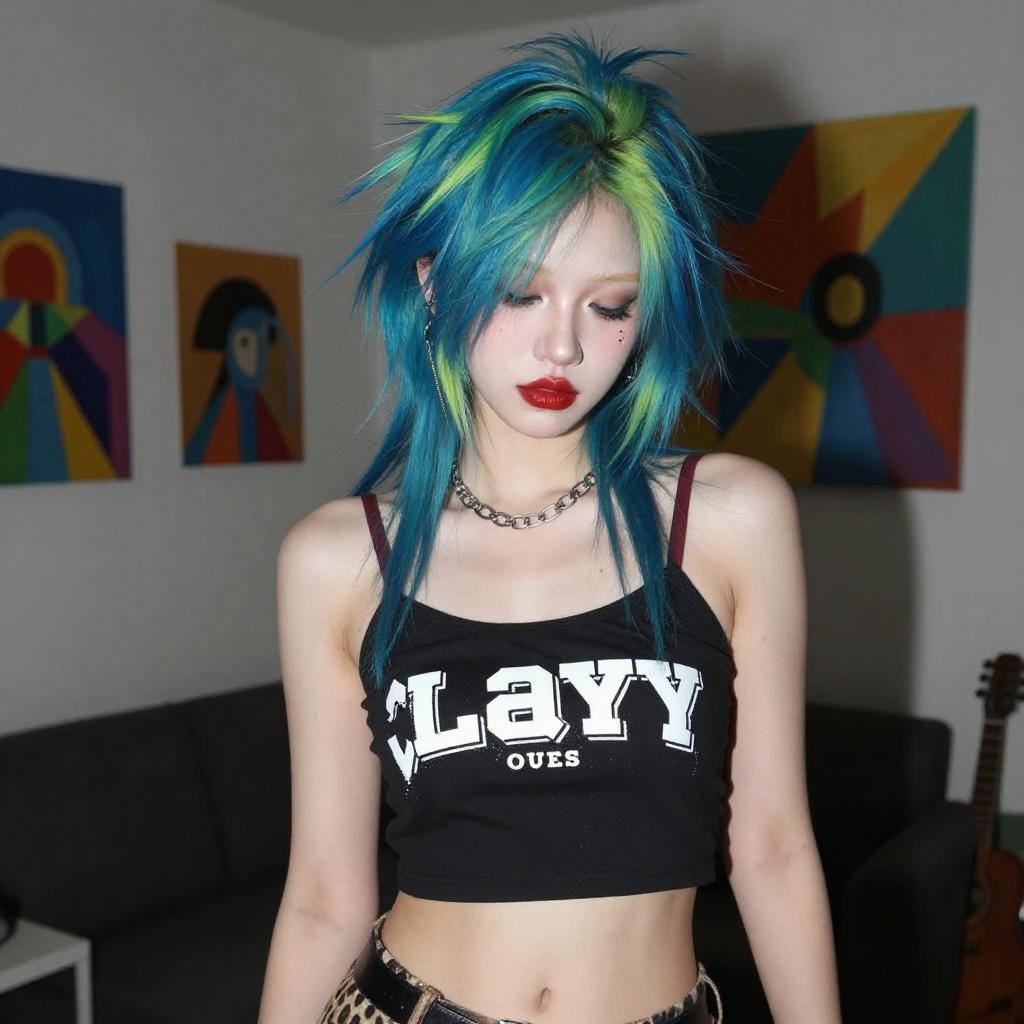 Photograph of a pale-skinned, blonde woman with short, spiky hair and black ear gauges. She wears a black "Slayer" crop top, studded belt, fishnet stockings, and black Converse sneakers. She sits with one leg raised, taking a mirror selfie with a black phone. Dark background, intense expression, and goth-punk style.