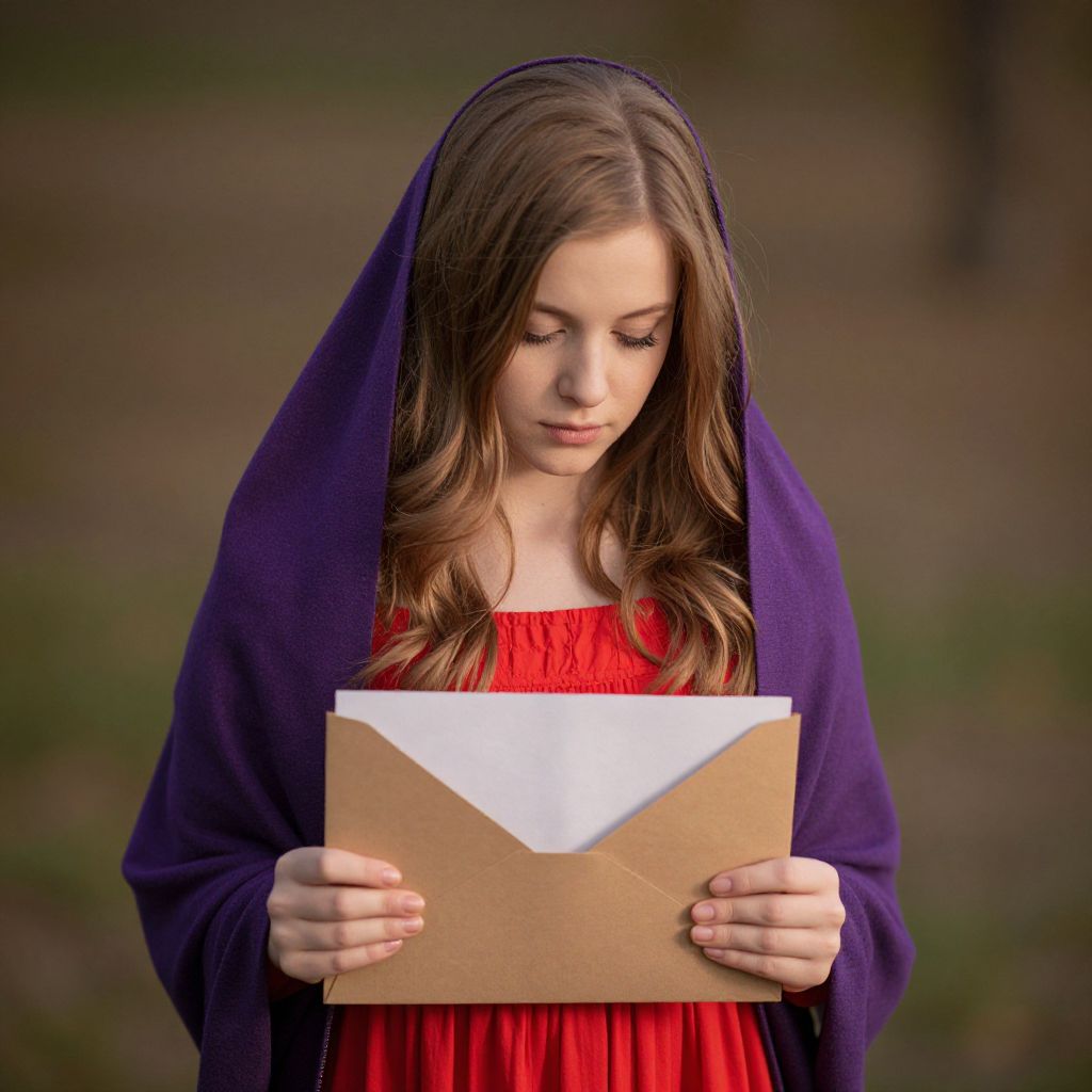 Photograph of a young woman with long brown hair, wearing a purple hooded cloak over a red dress, holding a brown envelope with a white letter