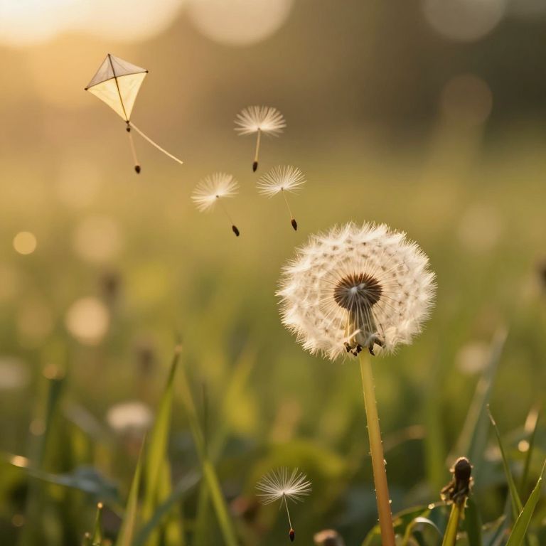 In a hushed meadow bathed in golden light, dandelion seeds transform into ethereal kites, carrying whispered dreams aloft, where freedom dances with the gentle breeze and hope takes flight.