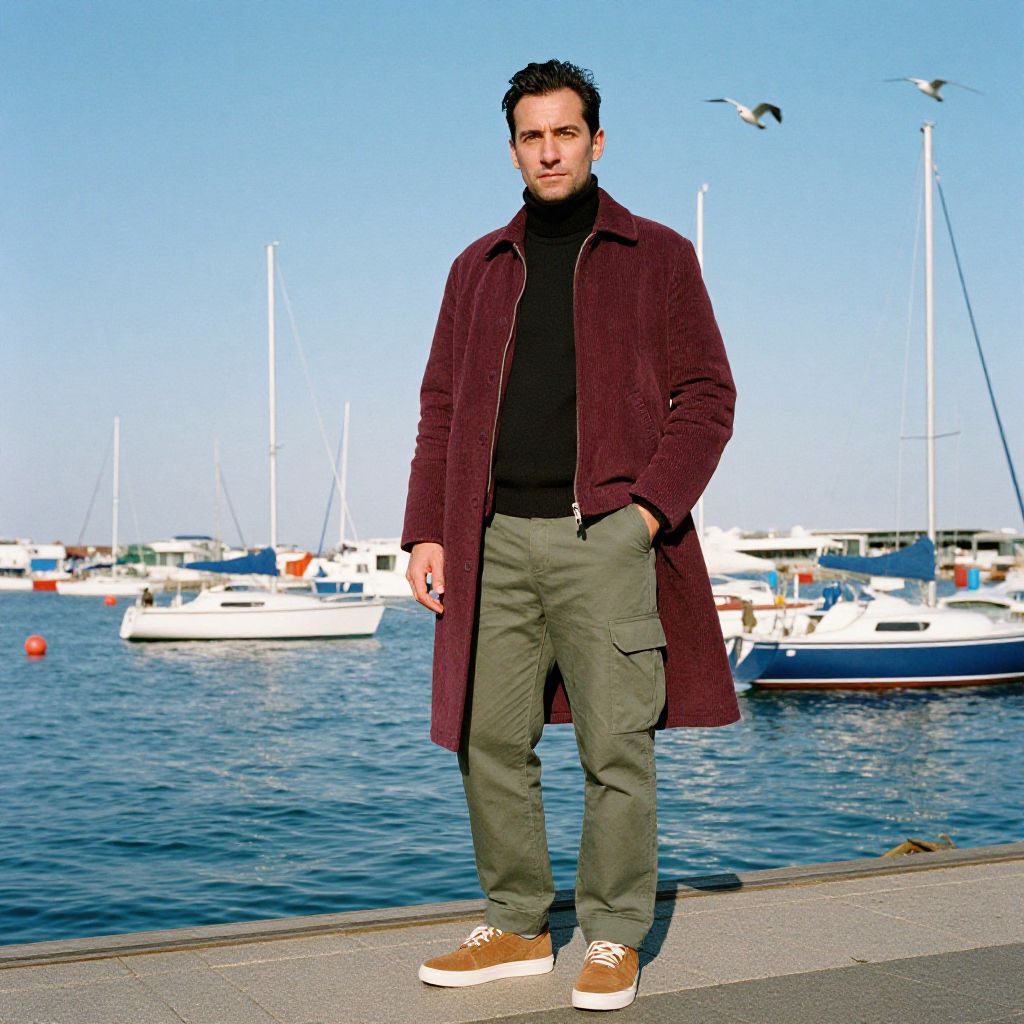 A man, burgundy corduroy bomber jacket, black turtleneck, olive green cargo pants, brown suede sneakers, longline overcoat, sun-drenched docks, colorful sailboats bobbing, kodak sp analog photo, relaxed expression, seagulls soaring overhead. Man has masculine face and piercing eyes