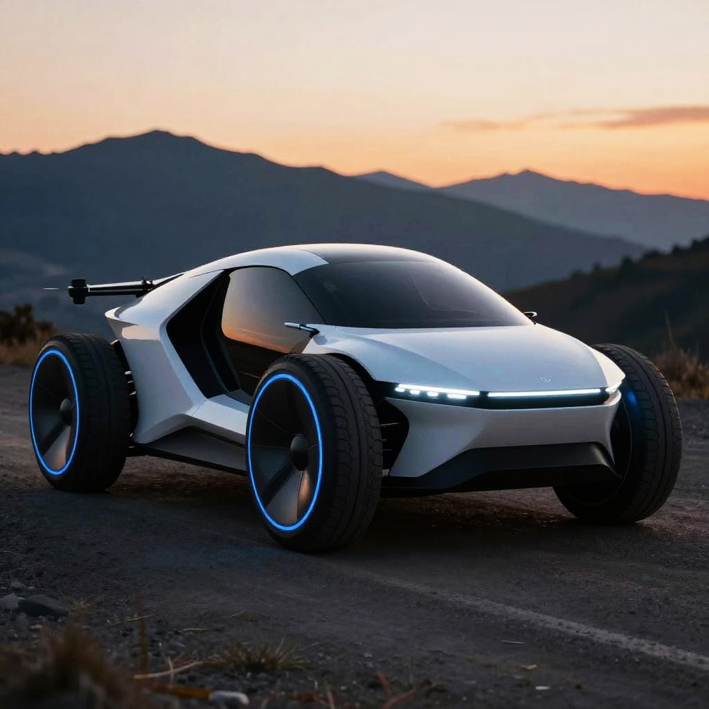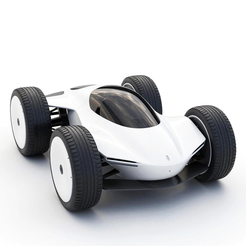 This is a digital rendering of a futuristic white flying car with four large, circular wheels and sleek, aerodynamic design. The car has a black, glossy cockpit and smooth, curved lines. The wheels are positioned at the corners, giving it a unique, hover-like appearance. The background is a simple white, making the car the main focus. The overall style is modern and high-tech.
