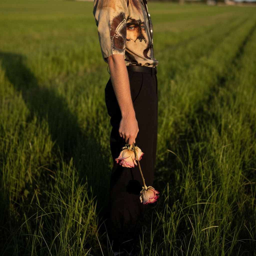 Photograph of a person standing in a sunlit grass field, wearing a patterned shirt and black pants, holding pink roses.