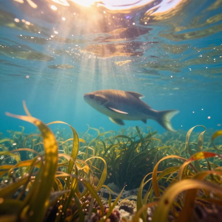 A mesmerizing underwater scene evokes the dreamy atmosphere of Impressionist masterpieces, with softly swirling sea grasses in vibrant hues dancing beneath the surface. A majestic creature glides through this enchanting aquatic garden, its form gently blurred as if captured in a fleeting moment of tranquility. The warm glow of sunlight filters through the clear blue water, casting a magical golden hue on everything it touches and imbuing the scene with an air of peace and wonder.