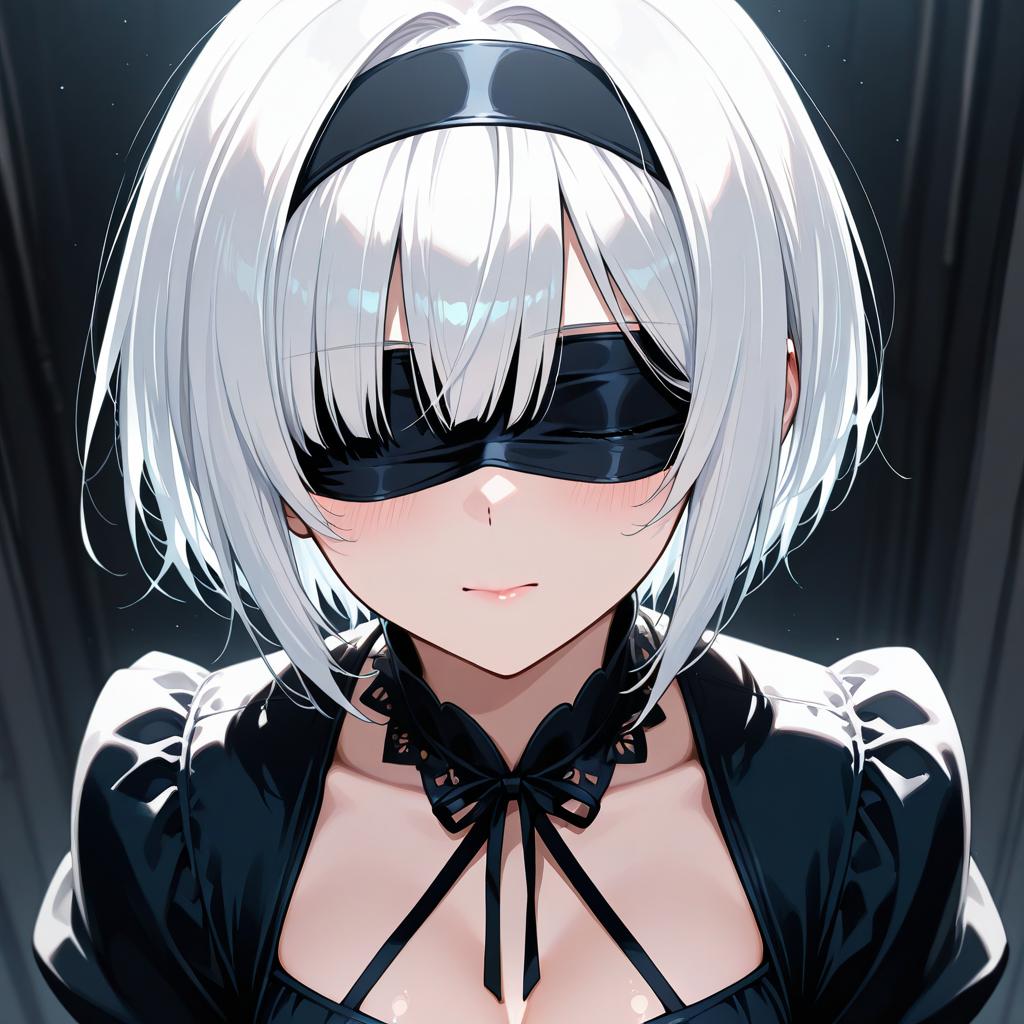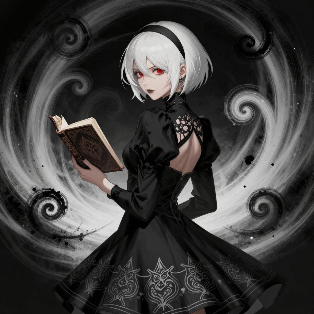 Digital anime-style artwork featuring a female character with short white hair and red eyes. She wears a detailed black backless dress with intricate patterns and holds an ornate book. The background is dark with swirling white and black gothic swirls, enhancing the mysterious atmosphere.