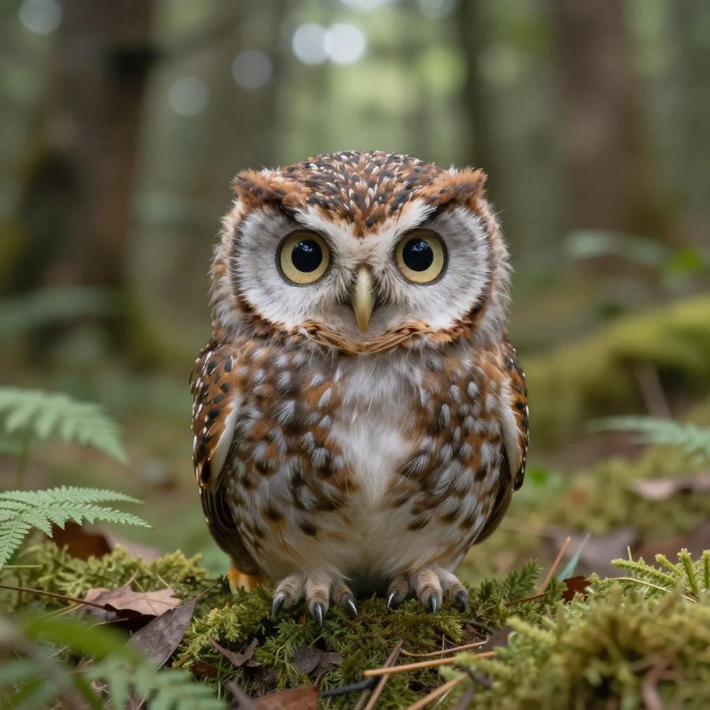 Realistic photo. Barn owl dressed as Snow White, intricate feather detail, adapted blue bodice and puffed yellow skirt for wings, small red ribbon near the ear tuft, perched on a mossy branch in a forest dressed as a Snow White posing for an image, cute and charming. realistic photo