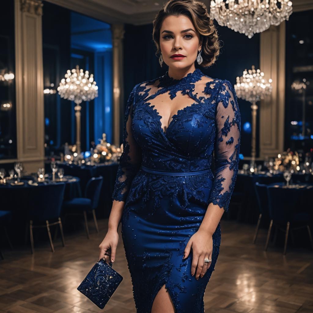 Photo of a Curvaceous woman, Messy Updo, New Year's Eve outfit, elegant sequined dress in Royal Blue, form-fitting with Lace, high heels in chic black ankle straps, statement jewelry, sparkling earrings, evening clutch, grand ballroom, dramatic lighting