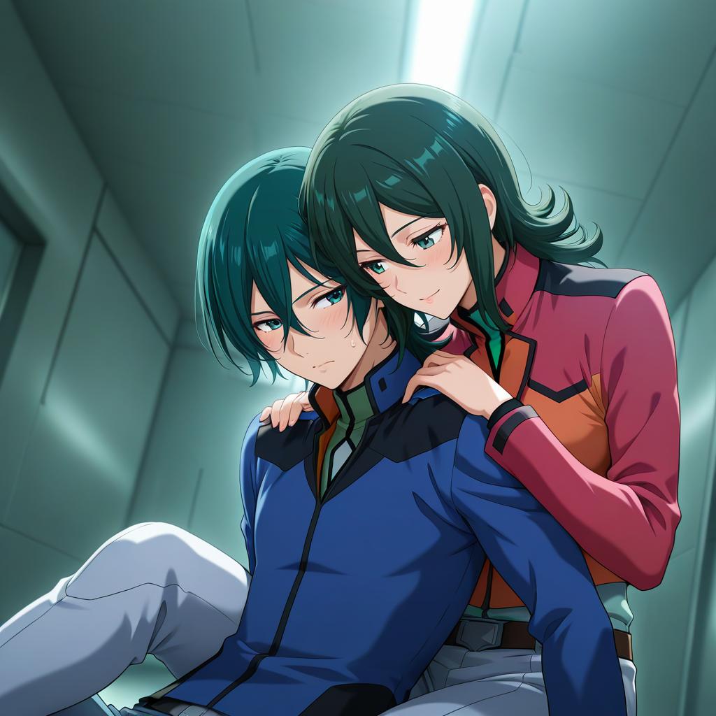 Digital anime-style illustration featuring two characters from the Gundam universe wearing Celestial Being uniforms. One character with heterochromia and green hair is dressed in a blue celestial being uniform, sitting with a serious expression. The other character, with similar green hair, is embracing the first character from behind, wearing a pink and orange uniform, glowing softly in futuristic corridor lighting.