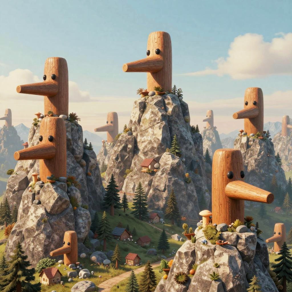 Pinocchio mountains depicted as a dreamlike range with oversized wooden noses sticking out from rocky summits, fairy tale ambiance, soft pastel colors, intricate textures