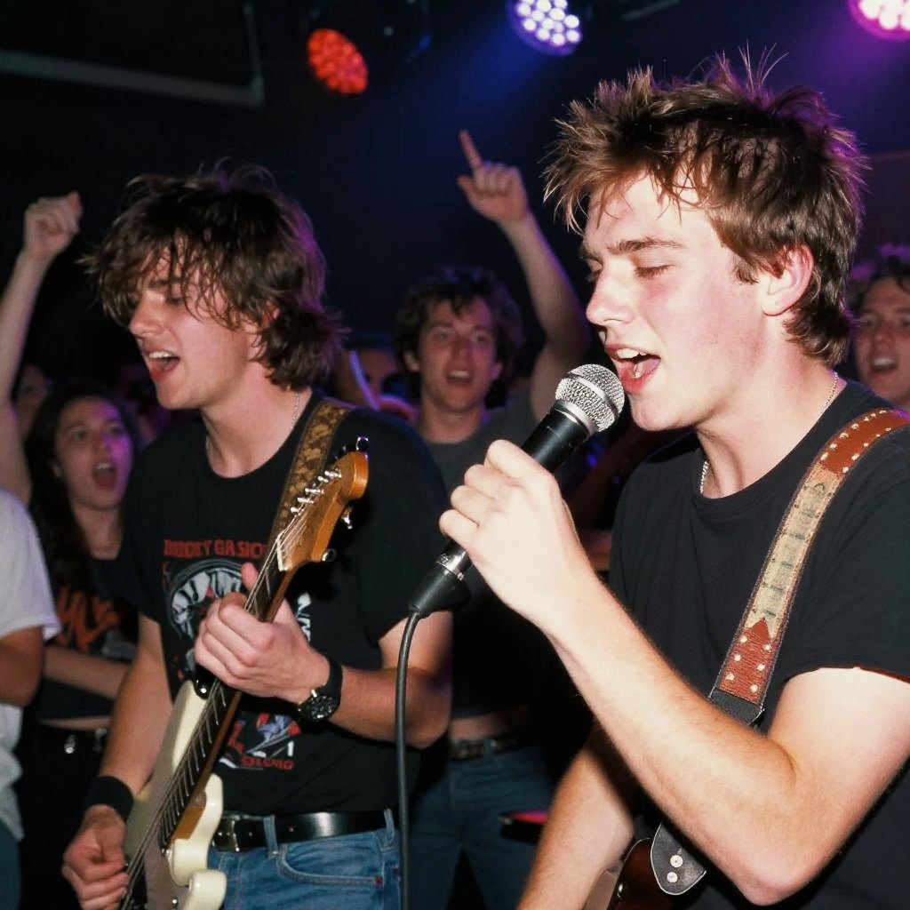 Korn younger band on stage during their early career, vibrant 90s grunge atmosphere, dynamic lighting, energetic crowd, gritty textures, nostalgic concert vibe, detailed faces