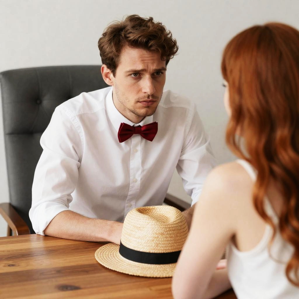 Man with short brown hair, white shirt, red bow tie, leaning forward, intense gaze, facing topless woman with long red hair, sitting at wooden table, straw hat between them, gray tufted chair in background. Indoor setting.