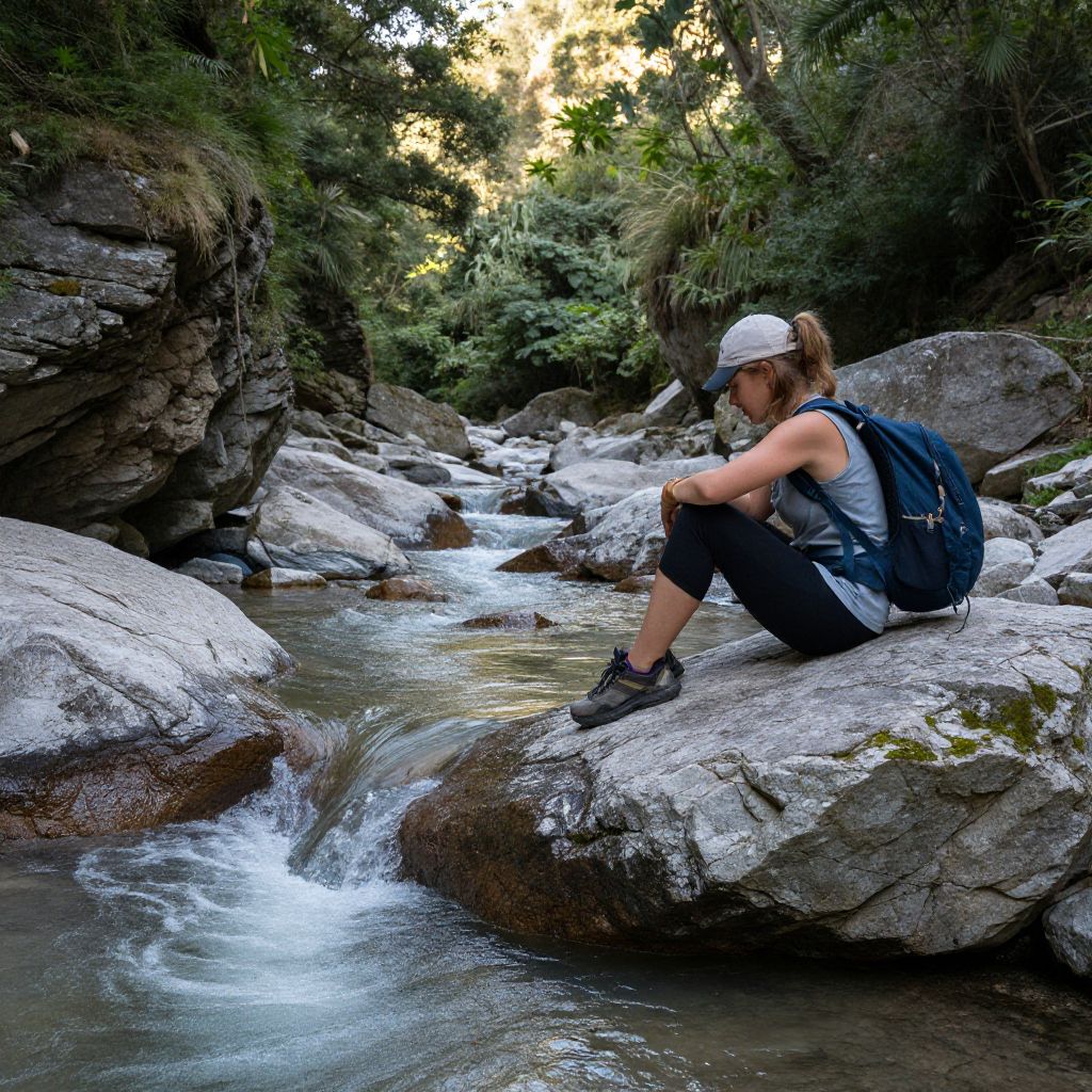 Photograph of a woman with brown hair, wearing a blue backpack and shorts, sitting on a rock by a rushing mountain stream, surrounded by forest and