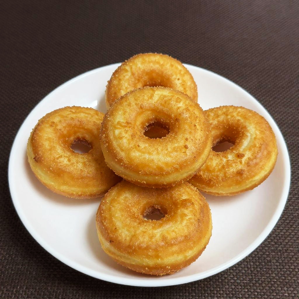 A close-up photo of five golden-brown, crispy fried doughnuts stacked on a white oval plate. The doughnuts have a slightly rough texture with visible sugar coating, giving them a shiny appearance. The plate is placed on a dark brown, woven fabric background, creating a contrast that highlights the warm color of the doughnuts. The image has a casual, homey feel.