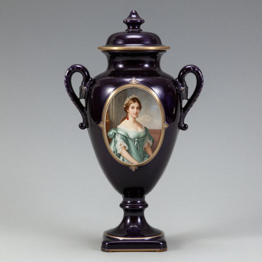 Royal Vienna vase featuring a dark purple glaze, adorned with a central oval portrait of a woman in an elegant green dress, flanked by two ornate handles, topped with a matching lid and finial, standing gracefully on a pedestal base.