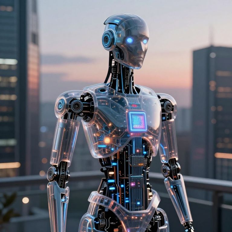 Artificial intelligence AI images depicting a humanoid robot with transparent casing revealing complex circuits and glowing processors, set against a sleek futuristic cityscape at dusk, soft ambient lighting with reflections and cyberpunk aesthetics.