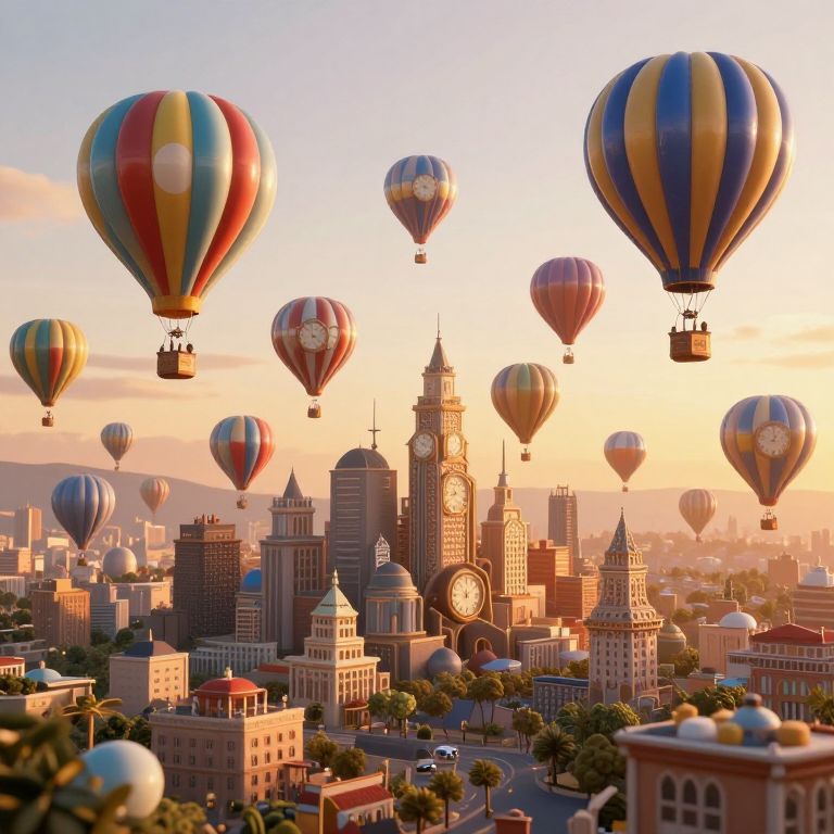 A whimsical 3D-rendered fantasy scene depicts a bustling balloon city, where colorful hot air balloons adorned with vintage clocks float gracefully against a golden-hour sky, symbolizing the fluidity of time as it weaves through the expansive urban landscape below.