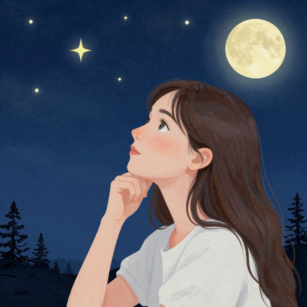 Overlap a thinking woman looking at the beautiful night sky with stars and the moon, soft colors only, gouache art,