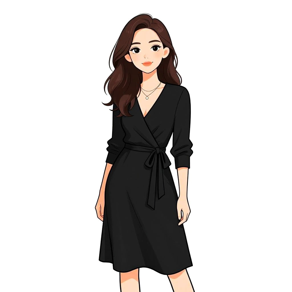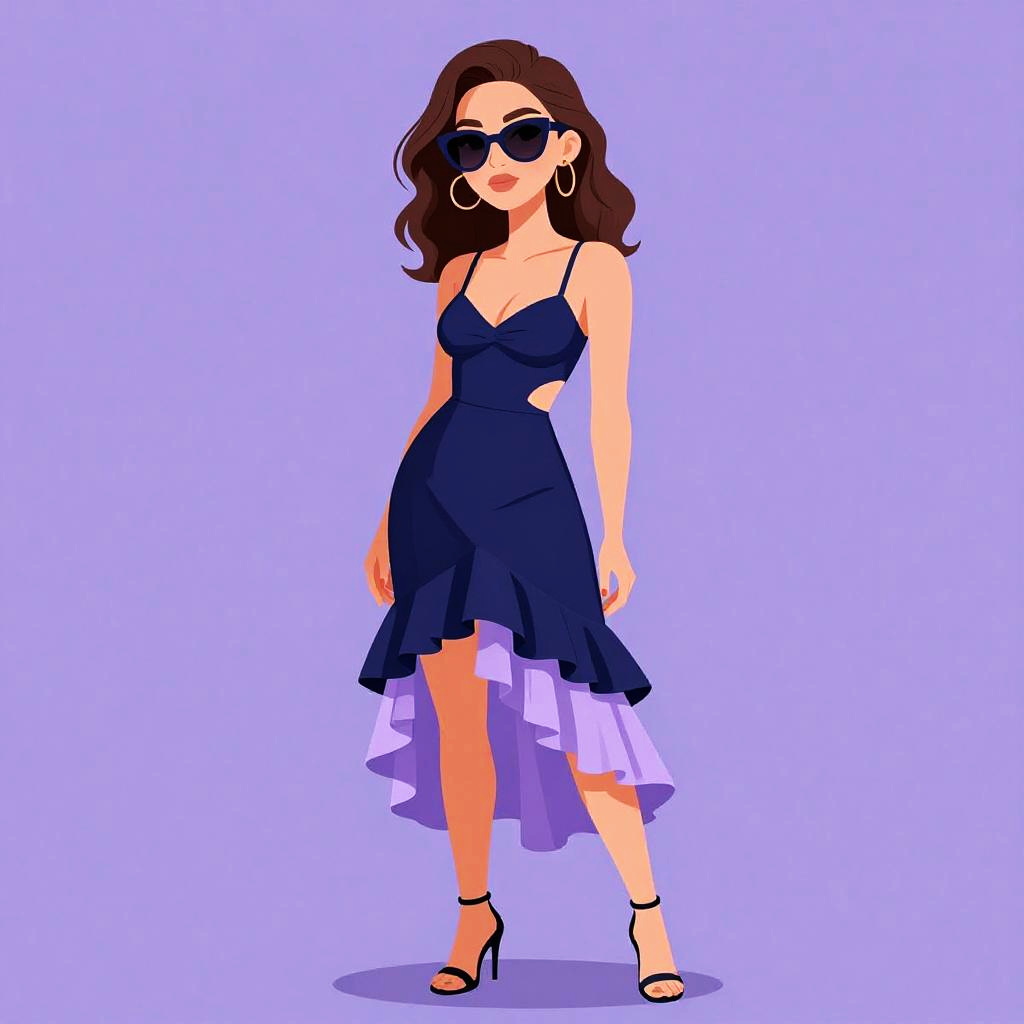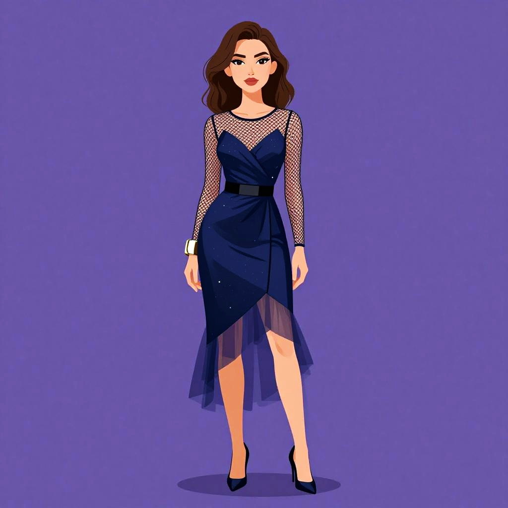 Woman with pretty face and pretty hair. Modern fishnet style wrap dress, sleek polyester blend, midnight blue color, asymmetric hemline, fitted bodice, long mesh sleeves, subtle shimmer, layered tulle underskirt, contrasting black belt, pointed toe heels, statement cuff bracelet, chic and sophisticated. --sref 1461