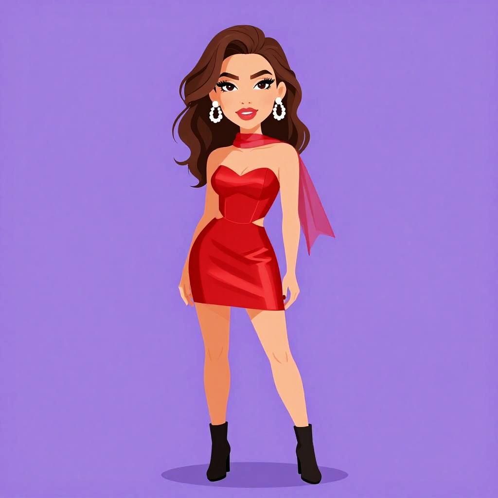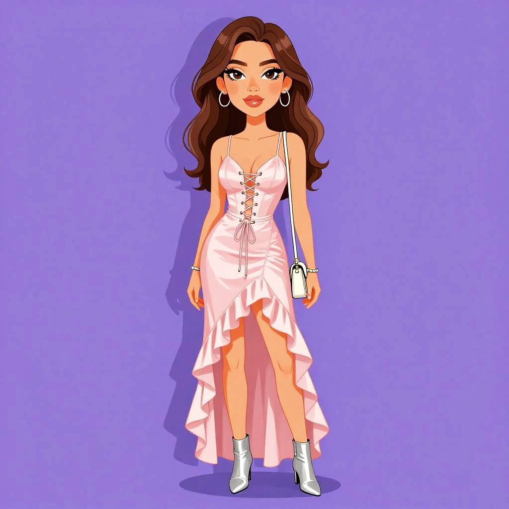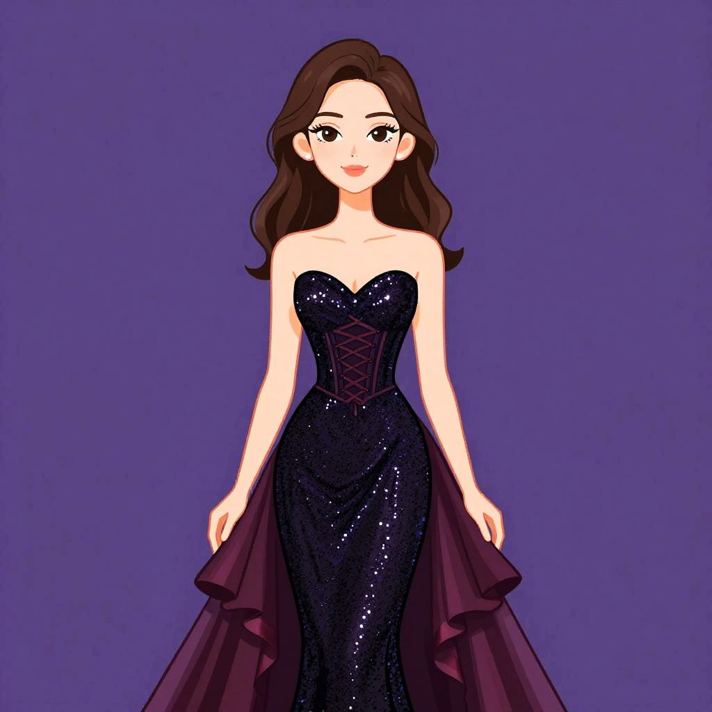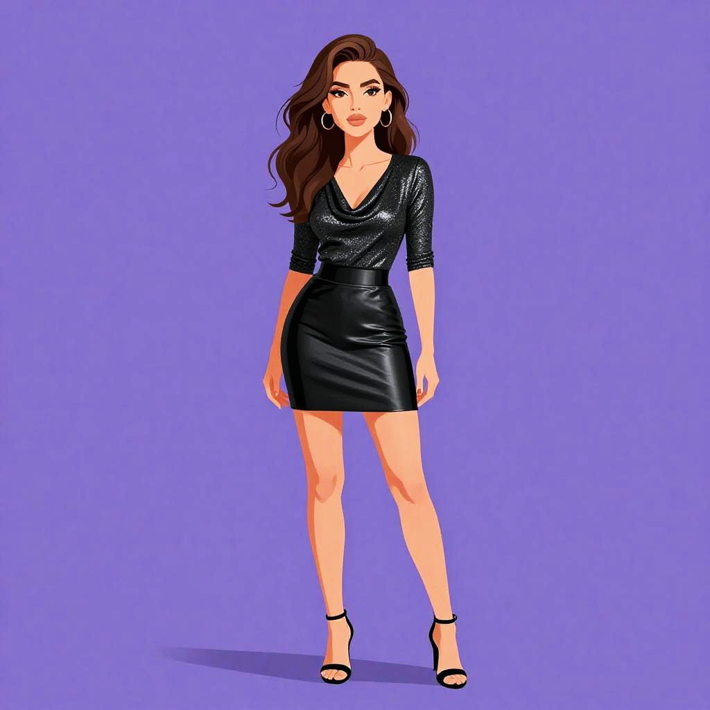 Woman with pretty face and pretty hair. Modern fishnet style wrap dress, sleek polyester blend, midnight blue color, asymmetric hemline, fitted bodice, long mesh sleeves, subtle shimmer, layered tulle underskirt, contrasting black belt, pointed toe heels, statement cuff bracelet, chic and sophisticated. --sref 1461