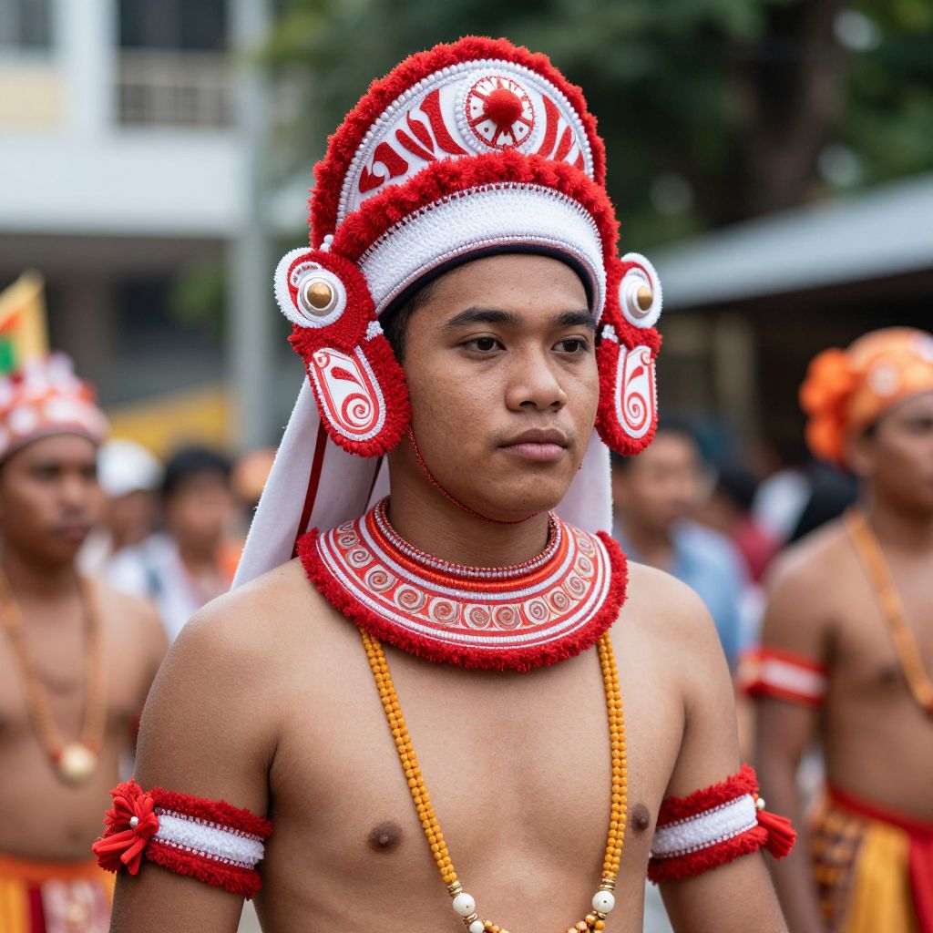Sinulog Festival Male Costume Simple, man in a red and white headdress and a necklace