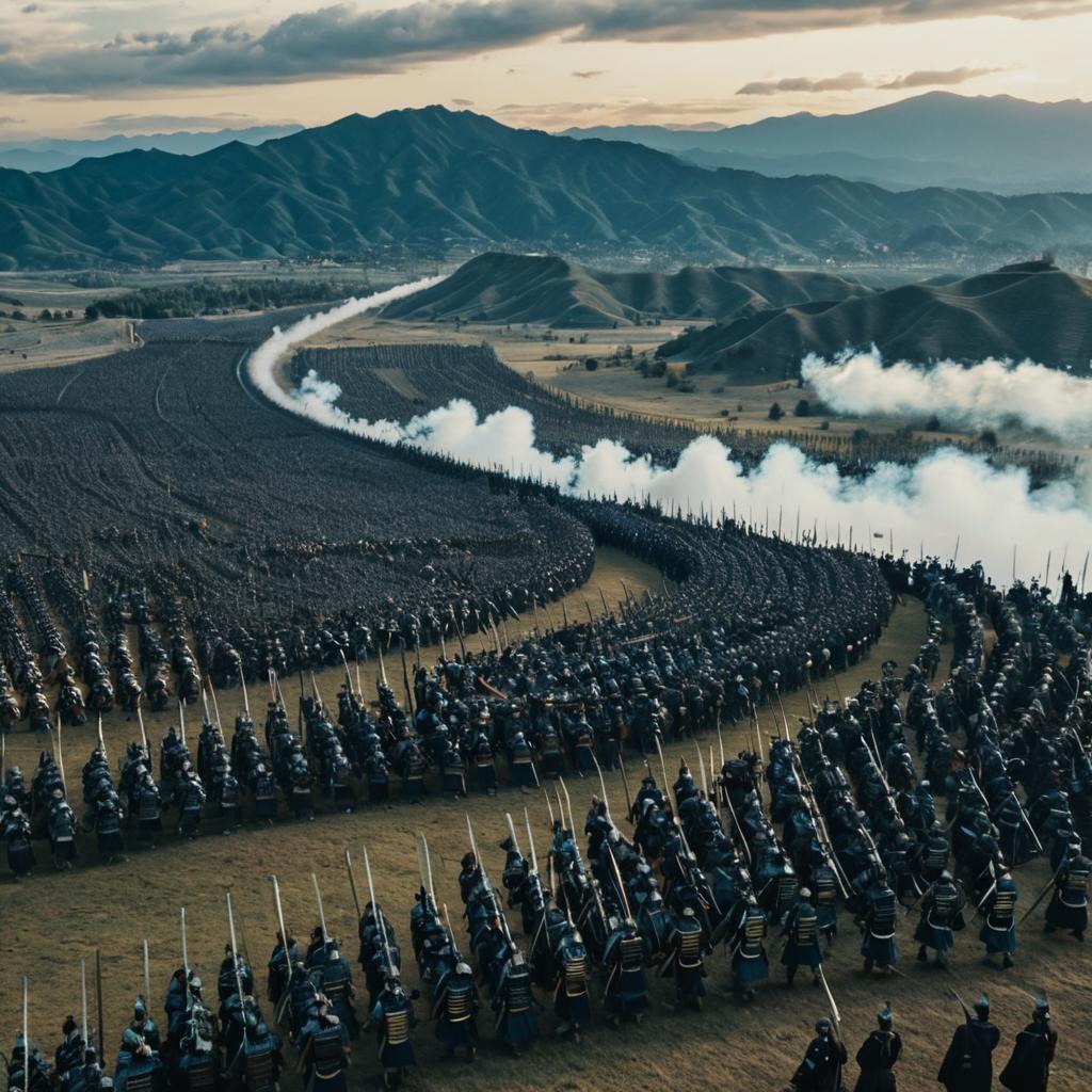 Ancient samurai battlefield, shot with a telephoto lens from a height of 15 meters. Clear image. 4k, the plain in the foreground. large number of samurai warriors. The screen is distorted by the curvature of the lens. Fighting is happening everywhere. The armies line up and face each other. low drone shots of armies beyond the horizon. mountain foothills at sunset, with clouds and rising smoke.