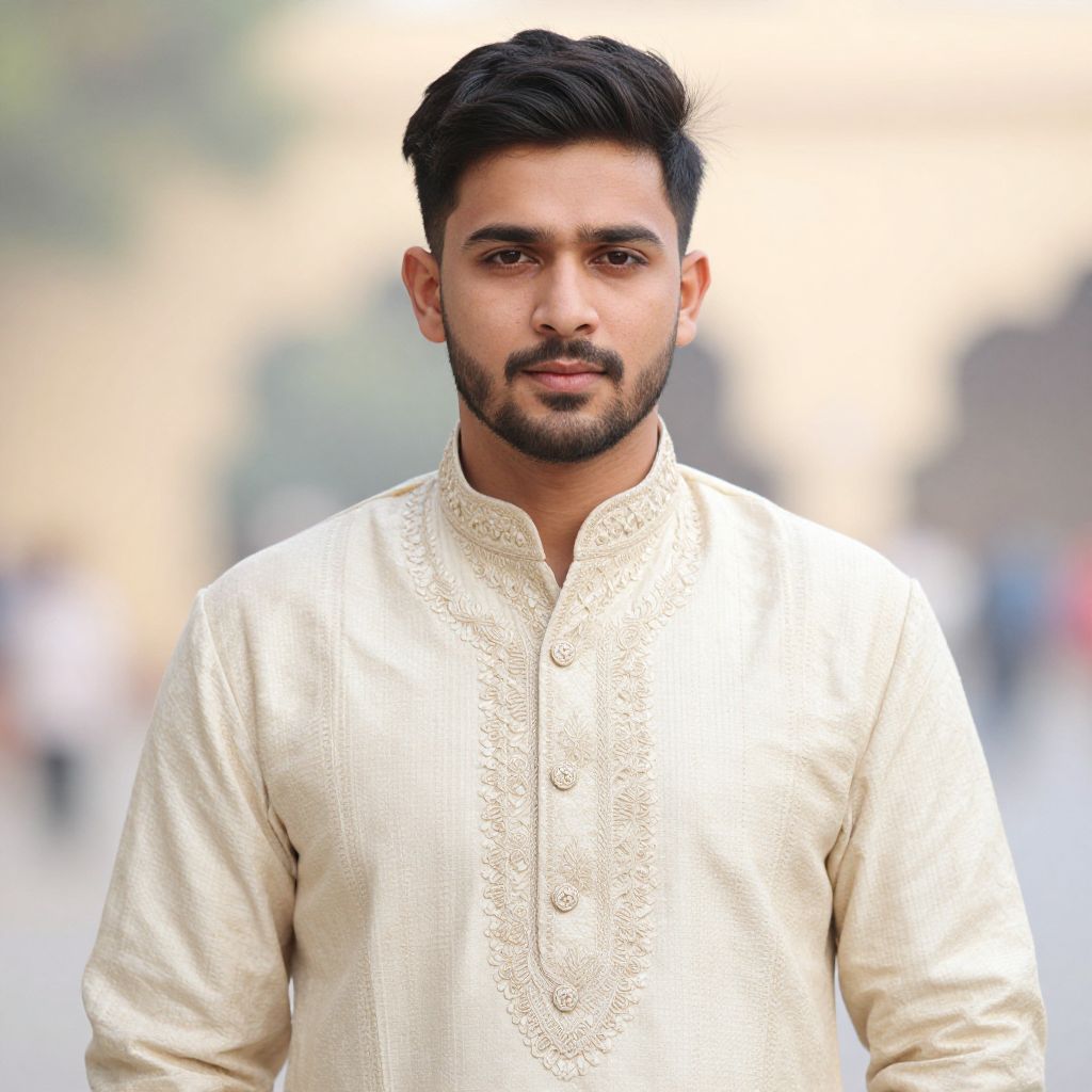 Photograph of a handsome South Asian man with dark hair and beard, wearing an elegant white embroidered traditional kurta, standing outdoors with a blurred background.