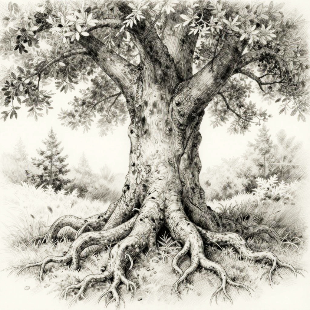 Stable drawing of an ancient tree with sprawling roots and textured bark, illustrated in a detailed pencil sketch style, soft shading and intricate line work emphasizing stability and strength, set against a muted forest background.
