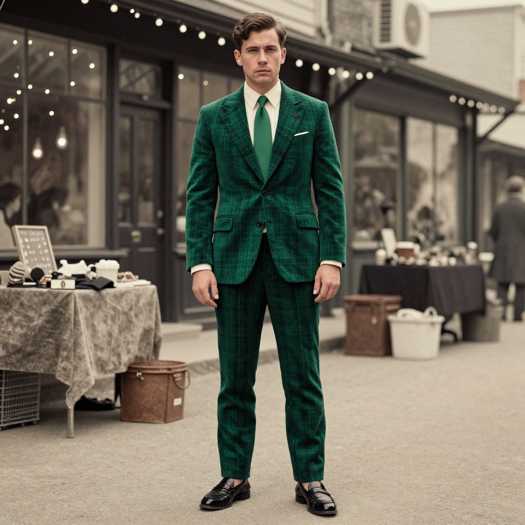 A man, navy windowpane suit, light pink dress shirt, patterned silk tie, tan suede monk strap shoes, coordinating tan leather belt, open atrium, high ceilings, colorful vendor booths, hand-tinted photograph, confident smile Man has masculine face and piercing eyes
