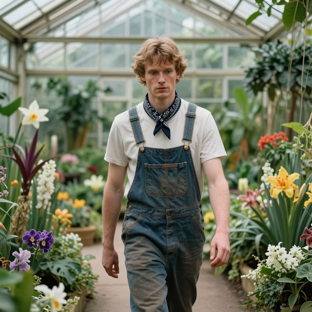 DEN_tristanholmes_SG, (in a giant glass green house filled with exotic flowers and plants wearing overalls and a bandana walking through the flowers, arboretum, green house, glass, plants, flowers:1.2), bokeh, f1.4, 40mm, photorealistic, raw, 8k, textured skin, skin pores, epiCRealism