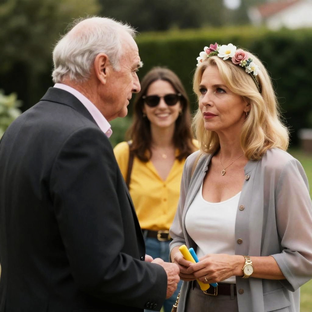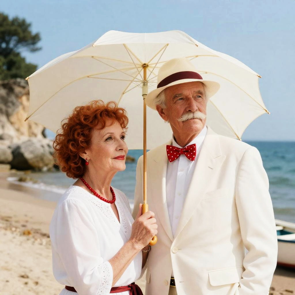 Photograph of two people by a pool. Blonde woman in red dress, sunhat, and sandals stands near the pool edge, looking down. Older man in white pants, white vest, black shirt, and white hat stands beside her, looking ahead. Green trees and grass in background. Bright sunlight.