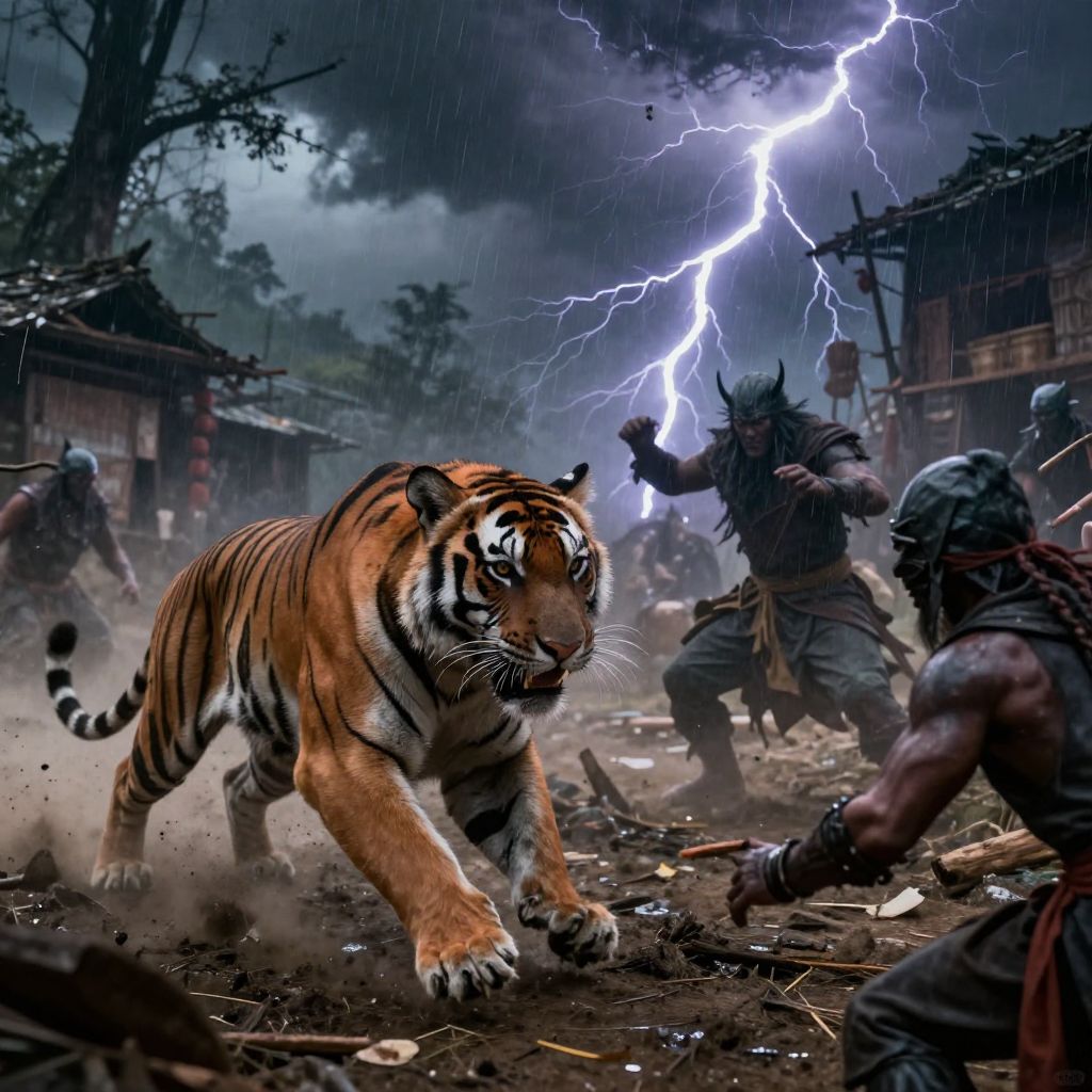 Photorealistic digital artwork: fierce tiger charges through stormy village, lightning illuminating battle scene with warriors in muddy, chaotic landscape.