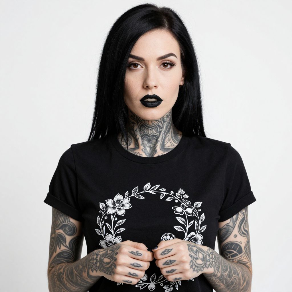 Photograph of a pale-skinned woman with straight black hair and bold black lipstick. She's wearing a black t-shirt with white floral designs, revealing extensive tattoos on her neck, arms, and hands. Her arms are fully sleeved in dark, intricate tattoos. She has dark eyebrows and a small beauty mark on her left cheek. The background is plain white, making her and her dark attire stand out sharply.