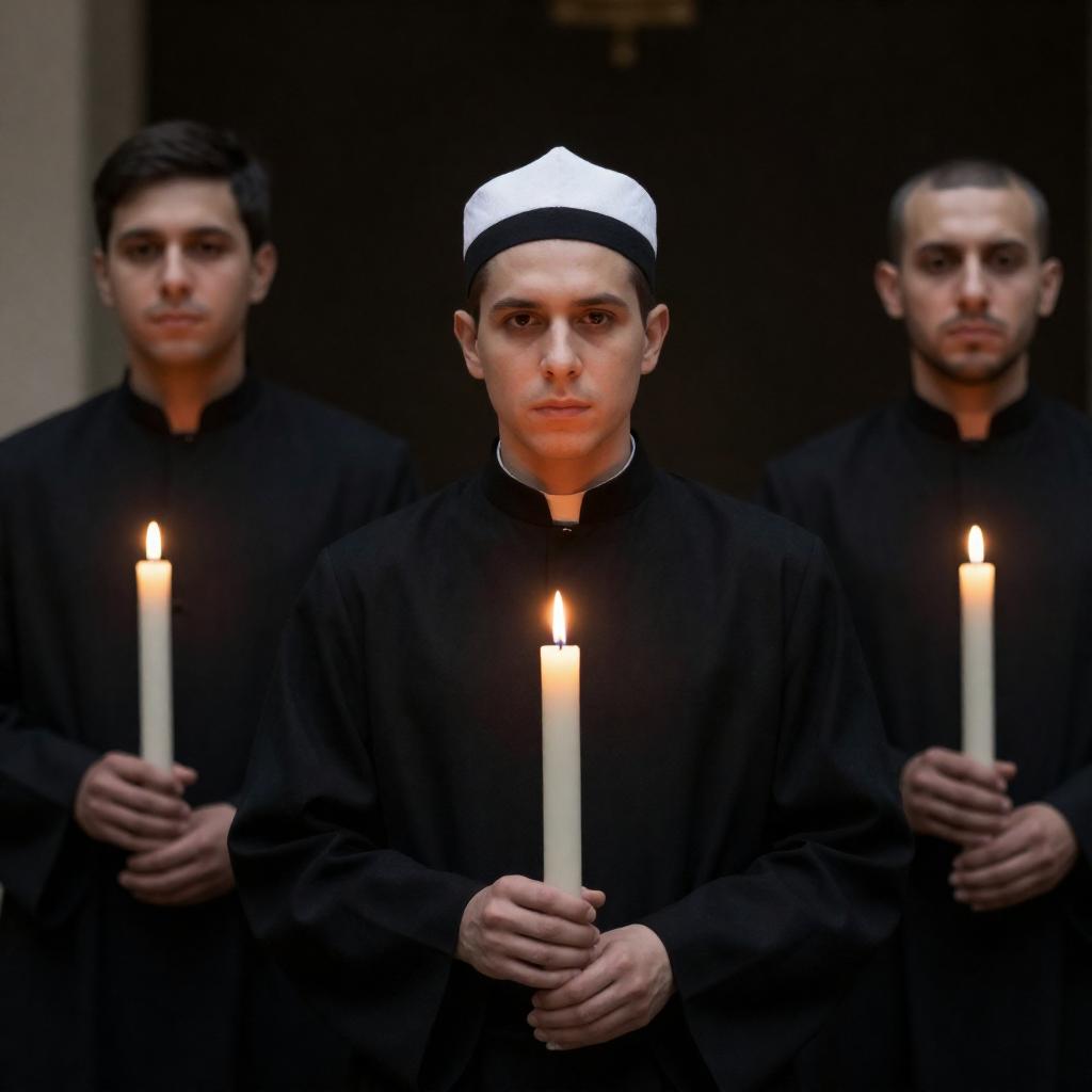 Three men in black religious robes holding lit candles. Center man wears white and black hat. Dark background. All looking forward. Candles lit, flames visible. Men's faces serious. Left man has short dark hair, right man has closely cropped hair.
