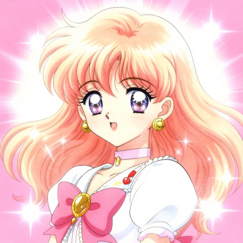 How to draw 90s anime style magical girl character with flowing hair, large shimmering eyes, detailed accessories, sparkles, and pastel colors, framed by burst effects and traditional 90s anime style backgrounds.