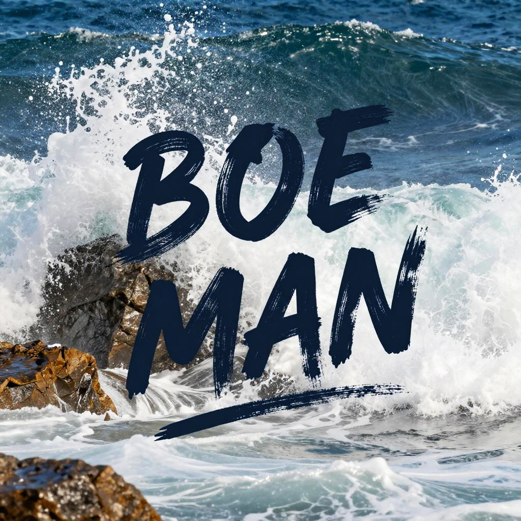 Text to be a man, dynamic brush stroke typography over a background of a roaring ocean wave crashing against rocks, intense movement and energy, vibrant blues and whites, powerful and natural elements combined, inspiring resilience theme.