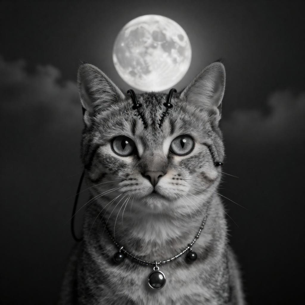 Stitched-up anthropomorphic cat with wide, intense eyes, standing against a full moon. Cat wears a necklace, has black cables attached to its head. Dark, cloudy background. Monochromatic, eerie atmosphere. Front view, head and upper body.
