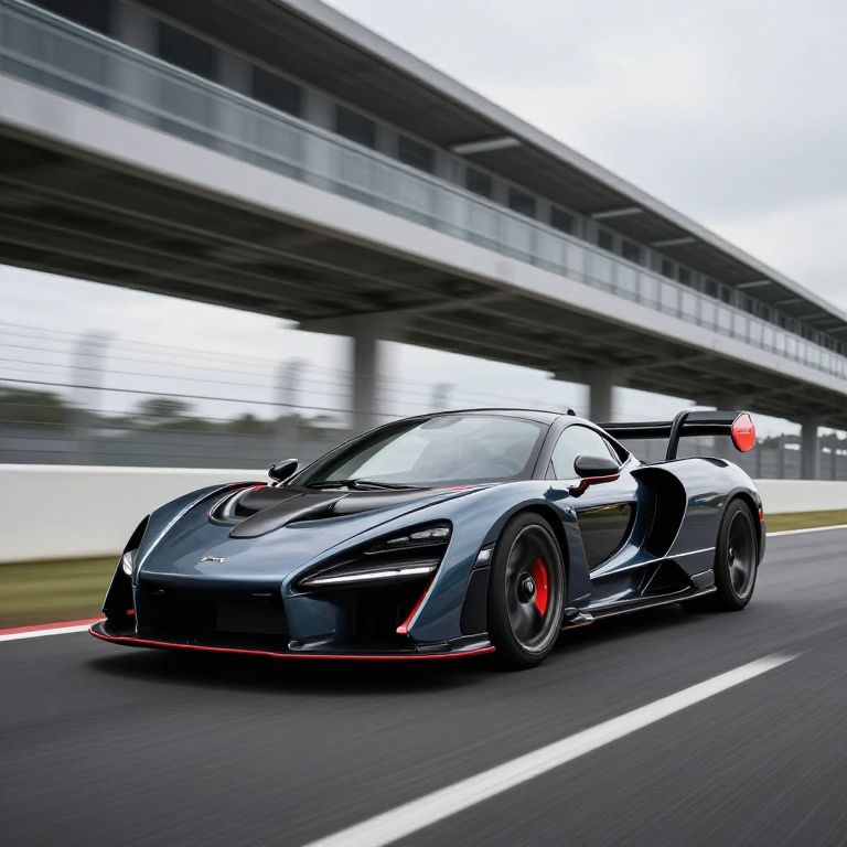 McLaren Senna speeding along a sleek race track under a modern bridge structure, its aerodynamic design highlighted by sharp lines and vibrant red accents.