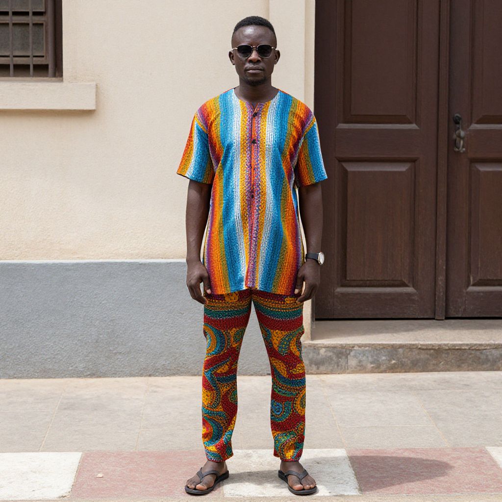 Man African Shirts Designs Costume, a man in a colorful shirt and pants standing on a sidewalk