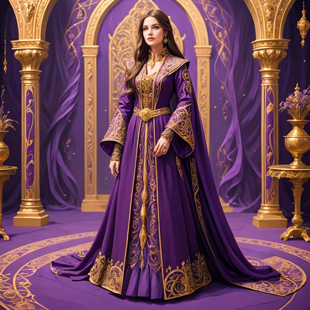 Photo of a Petite woman, Long Straight Hair, graceful outfit osrs, elegant robe with Tyrian Purple flowing fabric, Viscose with gold trim, medieval fantasy style, ornate details, long sleeves, high collar, mystical aura, Ankle Boots, Art exhibition, vibrant and bold colors