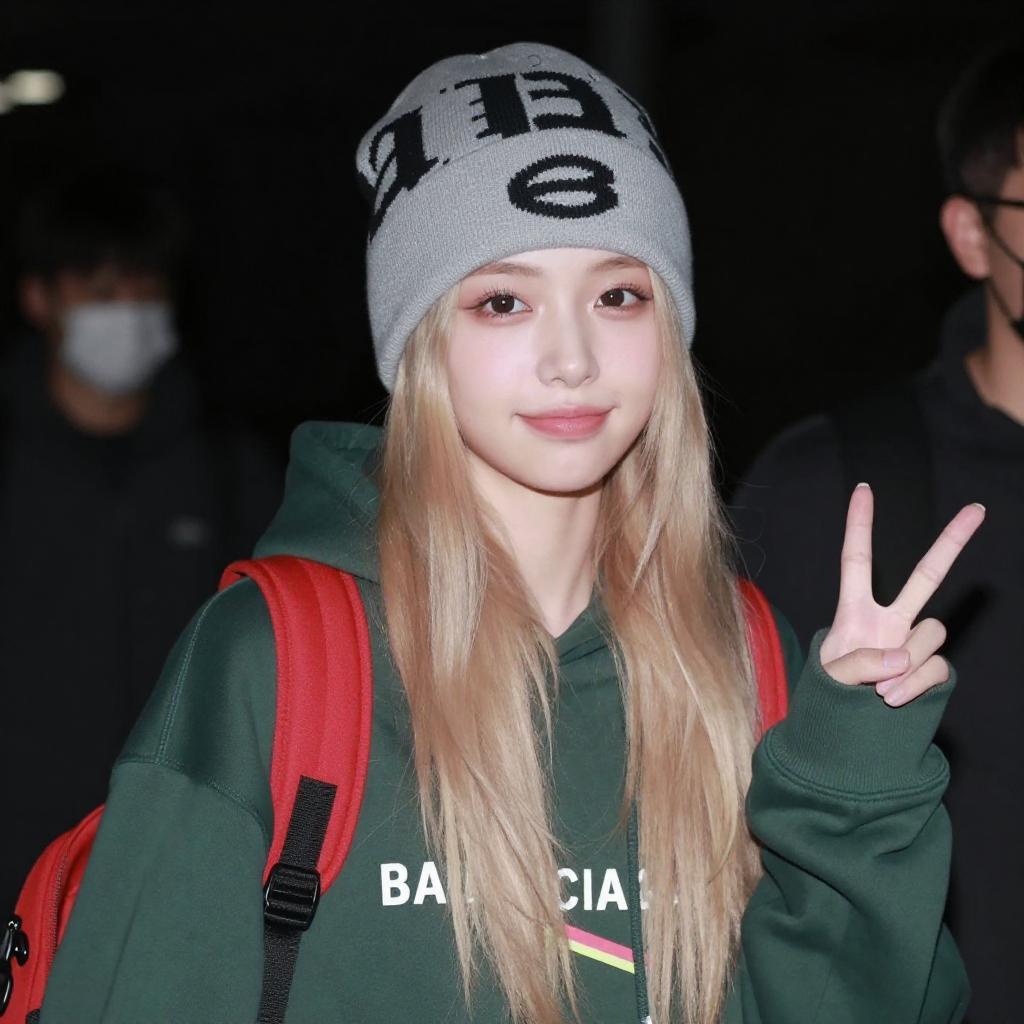 Photograph of a young woman with fair skin and long blonde hair, wearing a gray knit beanie with black patterns, a green Balenciaga hoodie, and a red backpack. She is smiling slightly and making a peace sign with her right hand. The background is dark with indistinct figures.